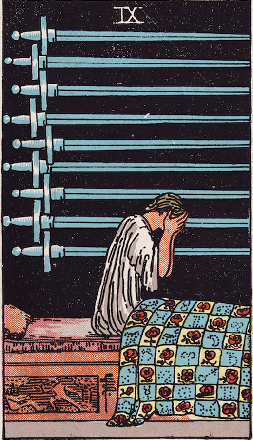 Повешенный, парализующая боль ;Девятка жезлов, крайнее беспокойство и дурное предчувствие ;Девятка кубков, нет точного значения при сочетании ;Девятка мечей ;Девятка пентаклей, нет точного значения при сочетании