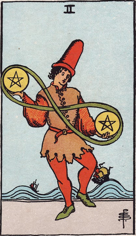 Жрец, отсутствие единства ;Двойка жезлов, использовать все имеющиеся возможности ;Двойка кубков, нет точного значения при сочетании ;Двойка мечей, нет точного значения при сочетании;Двойка пентаклей