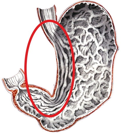 Вода, попав в желудок, проходит совсем другой путь, отдельный от еды и этому способствует строение желудка. Дело в том, что еда спускается в нижнюю часть желудка, вода же льется по специальным складкам слизистой оболочки сверху и практически сразу попадает в двенадцатиперстную кишку, имеющую щелочную среду. Посмотрите на этот рисунок.