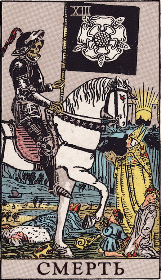 Смерть ;Десятка жезлов, Завершение дела ;Десятка кубков, Радость ;Десятка мечей, Несчастья ;Десятка пентаклей, Проблемы с деньгами