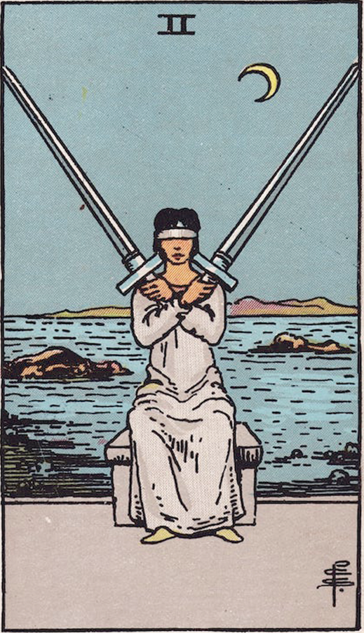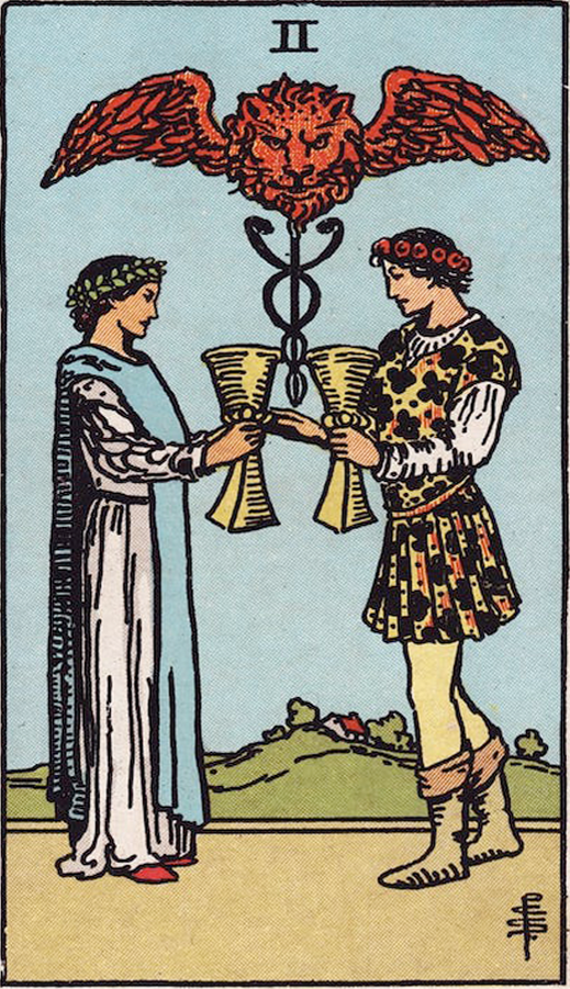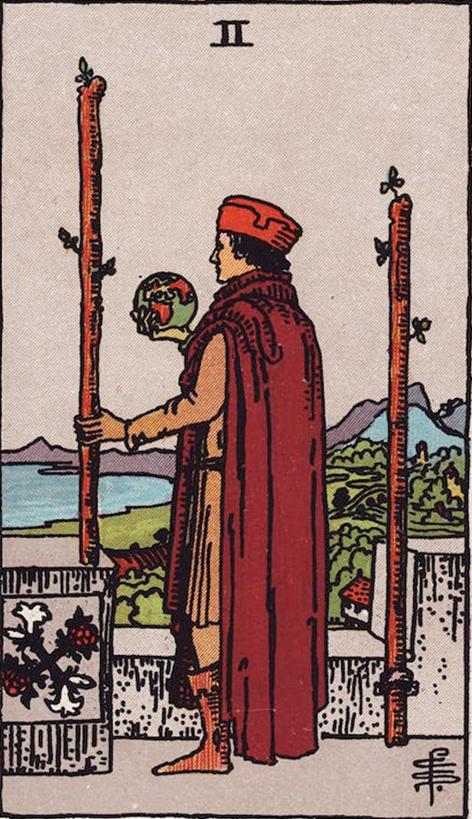 Жрец, обдумать свои позиции ;Двойка жезлов ;Двойка кубков, изучать контракт, планировать совместное будущее ;Двойка мечей, мучительная нерешительность ;Двойка пентаклей, финансовые затруднения
