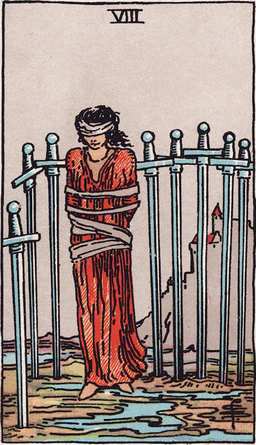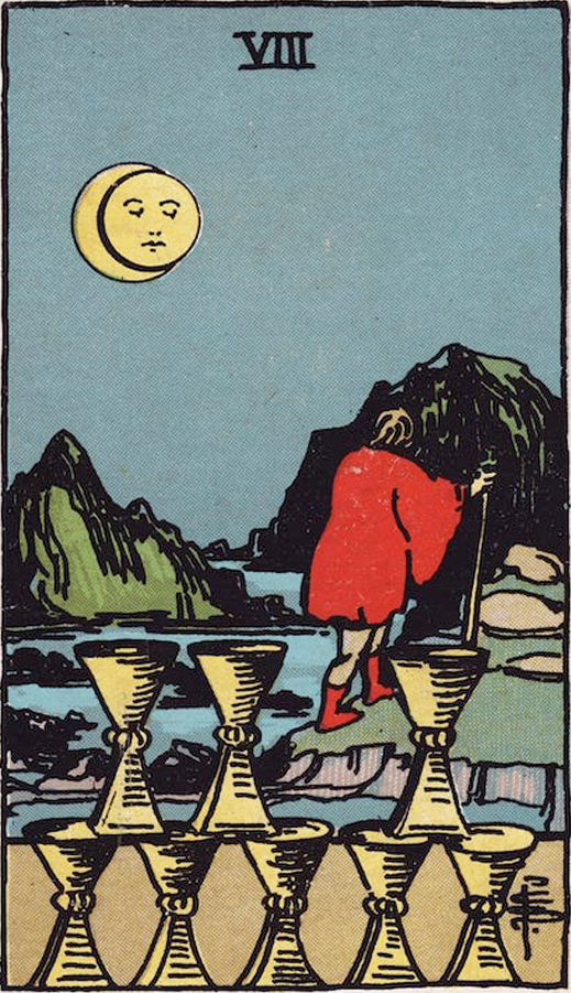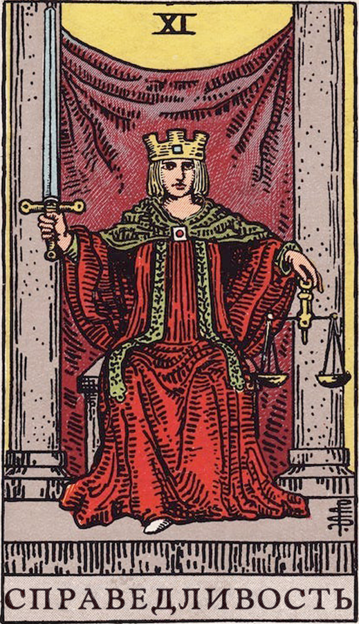 Правосудие, отмахнуться от разумных доводов ;Восьмерка жезлов, выбрать направление ;Восьмерка кубков, поиск себя, возможность путешествия ;Восьмерка мечей, ограниченные возможности, узкий кругозор ;Восьмерка пентаклей, поиск работы