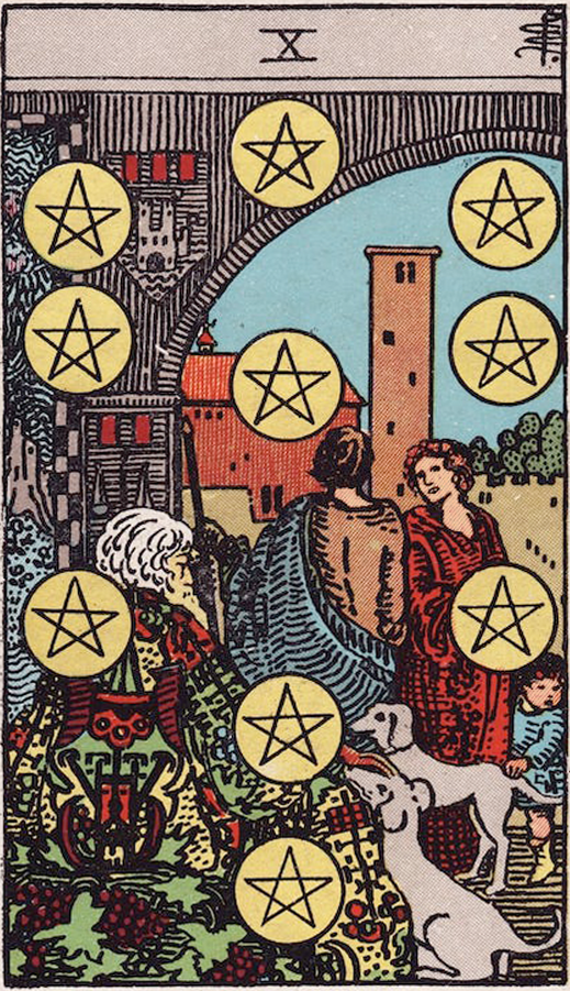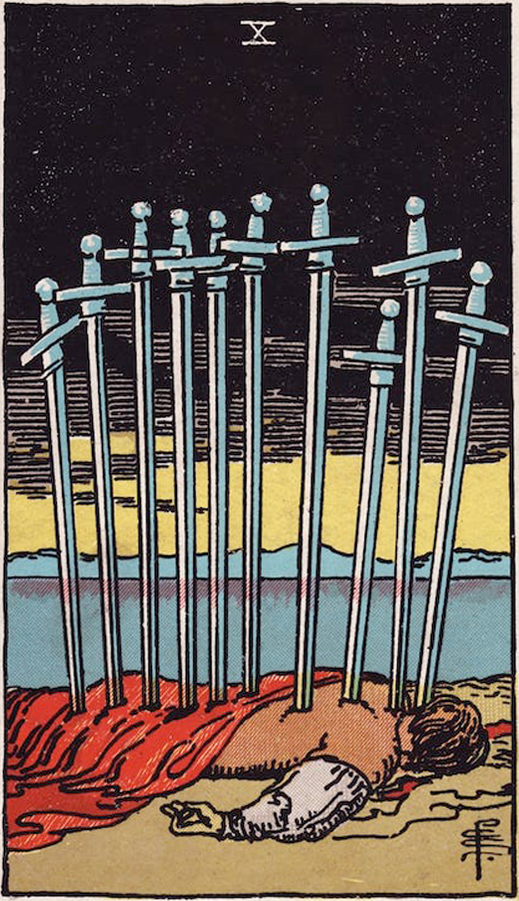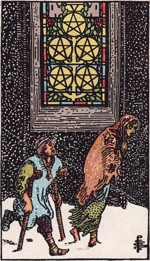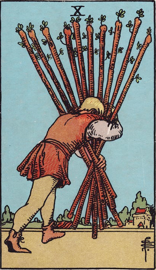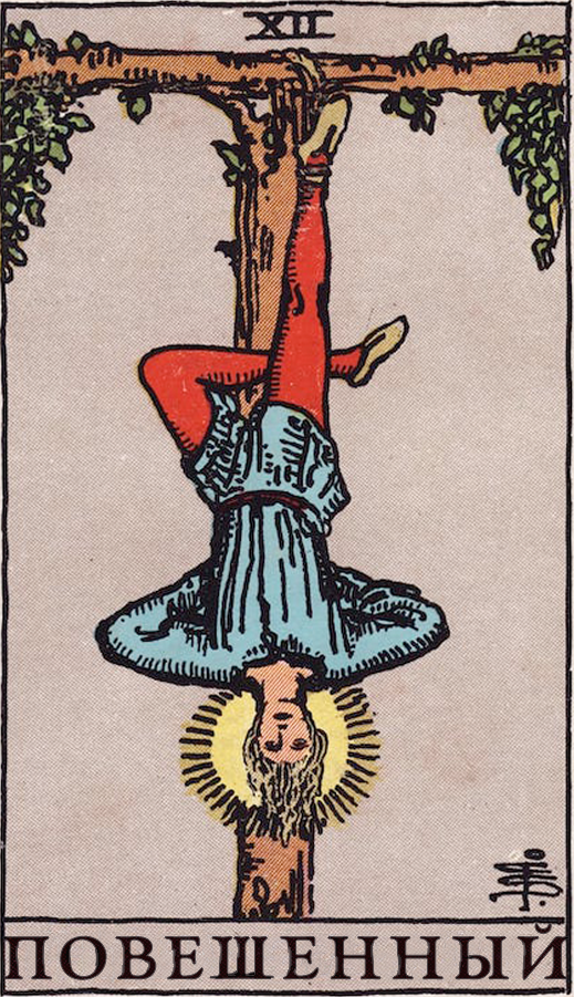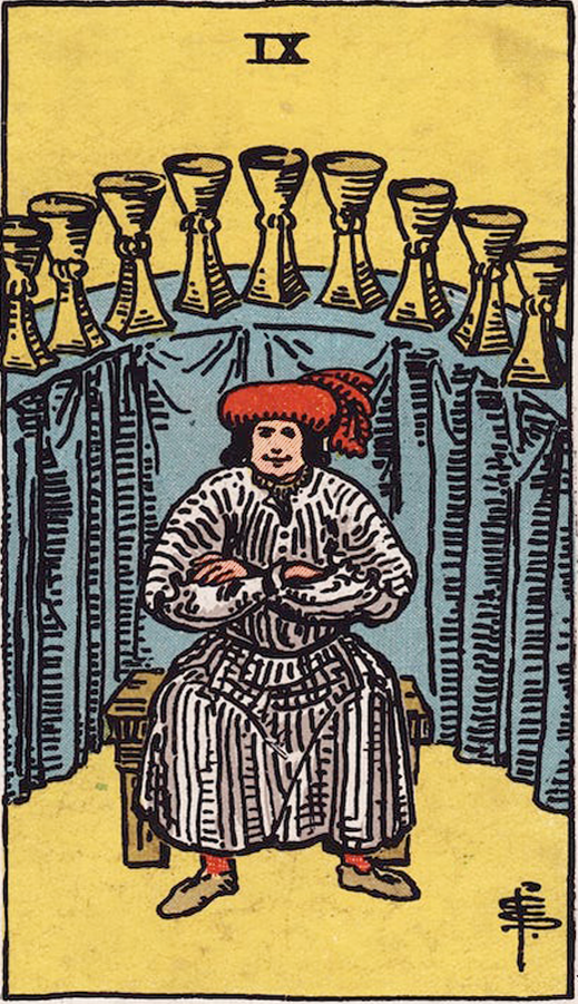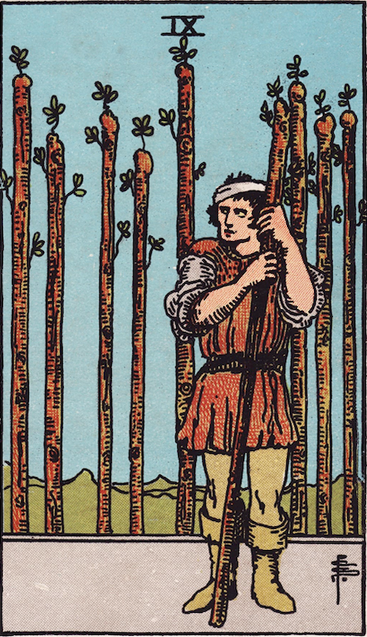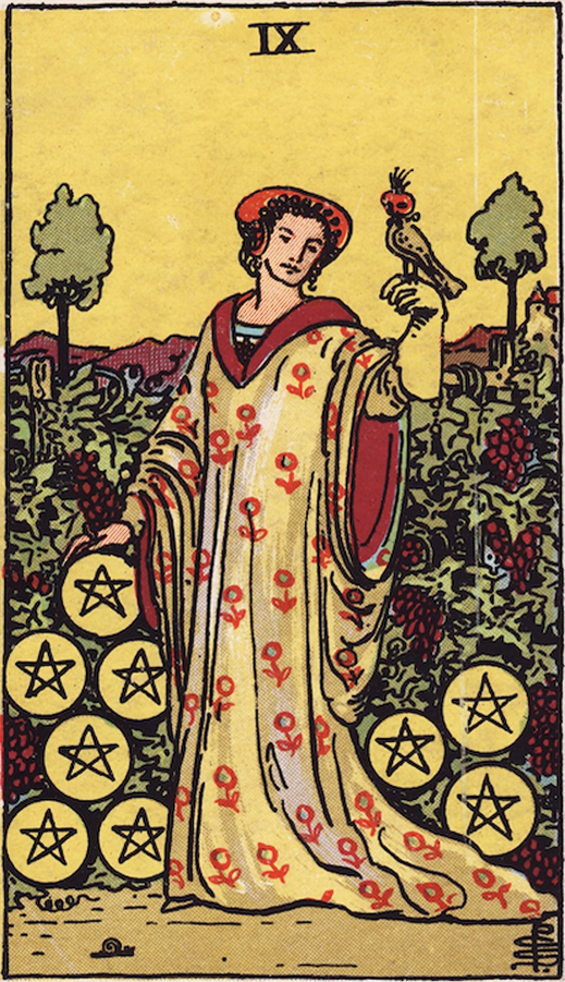 Повешенный, затянувшееся бездействие, ожидание ;Девятка жезлов, тяжкий путь познания ;Девятка кубков, мечтания, поиск счастья ;Девятка мечей, предчувствие беды ;Девятка пентаклей, оценка прибыли