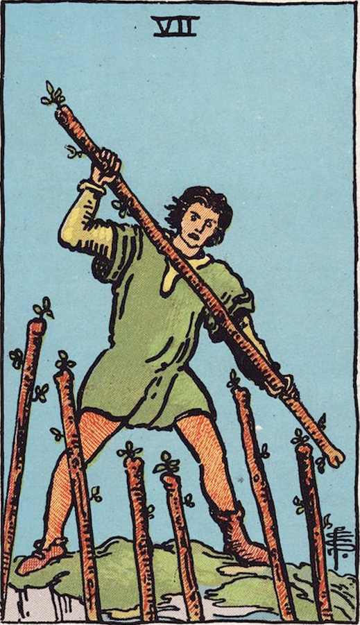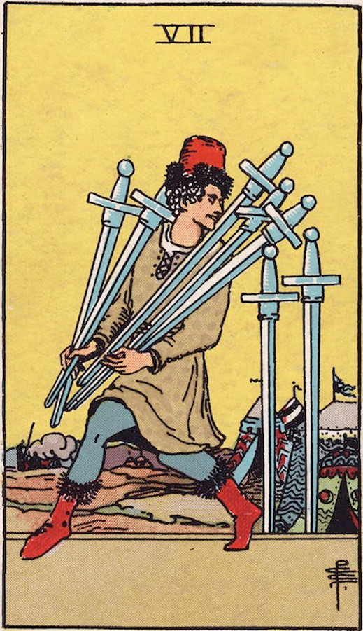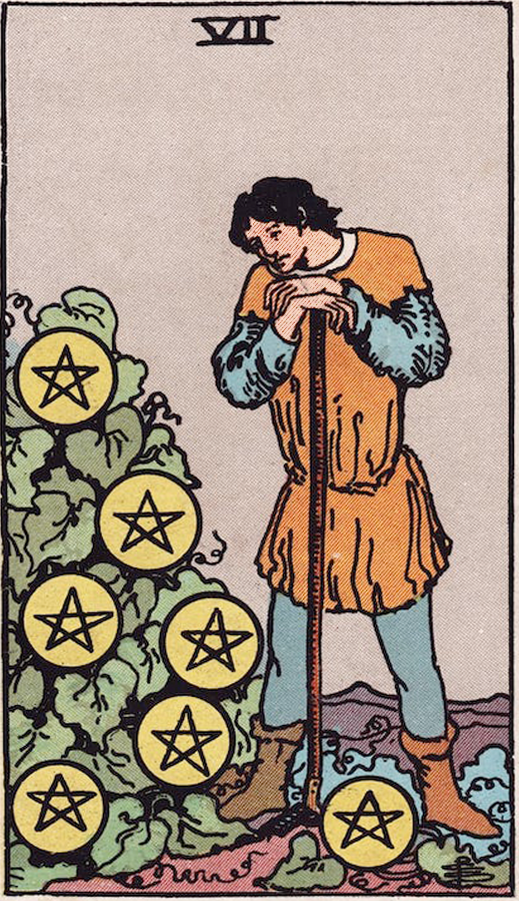 Фортуна, открытие новых перспектив ;Семерка жезлов, направление, сулящее немалые трудности ;Семерка кубков, строить планы ;Семерка мечей, наметить пути к отступлению ;Семерка пентаклей, отсрочка планов, оценка эффективности вложений