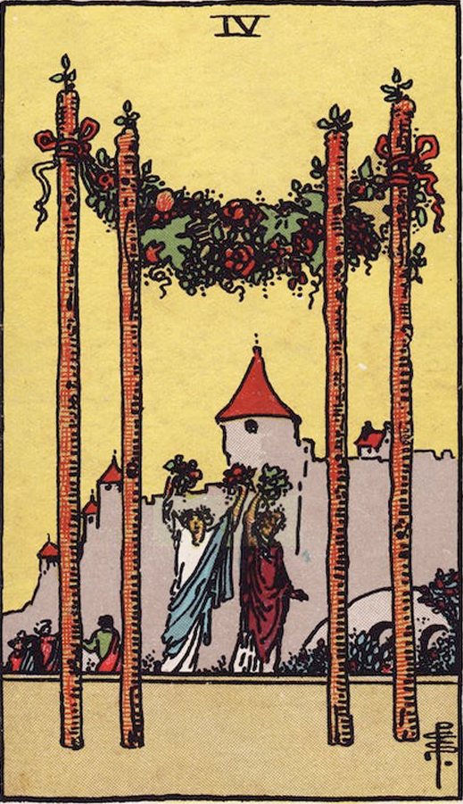 Колесница, обмыть покупку автомобиля ;Четверка жезлов ;Четверка кубков, невеселое настроение ;Четверка мечей, безделье, откладывание бытовых проблем ;Четверка пентаклей, привязанность к дому